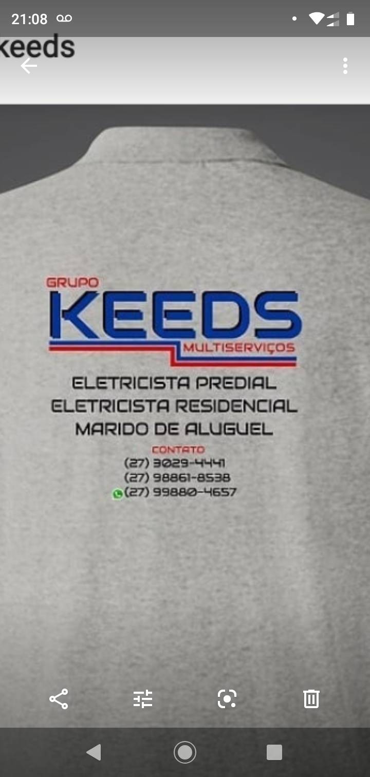 A KEEDS'MULTISERVICOS É UMA EMPRESA QUE ATUA NA PRESTAÇÃO DE SERVIÇOS DE ELETRICISTA PREDIAL, RESIDENCIAL E MARIDO DE ALUGUEL. TRABALHAMOS COM PROFISSIONAIS TOTALMENTE CAPACITADOS PARA ATENDER BEM NOSSOS CLIENTES. NOSSOS SERVIÇOS POSSUÍ GARANTIA DE 3 MESES, ALÉM DOS NOSSOS PREÇOS BEM SATISFATÓRIO.