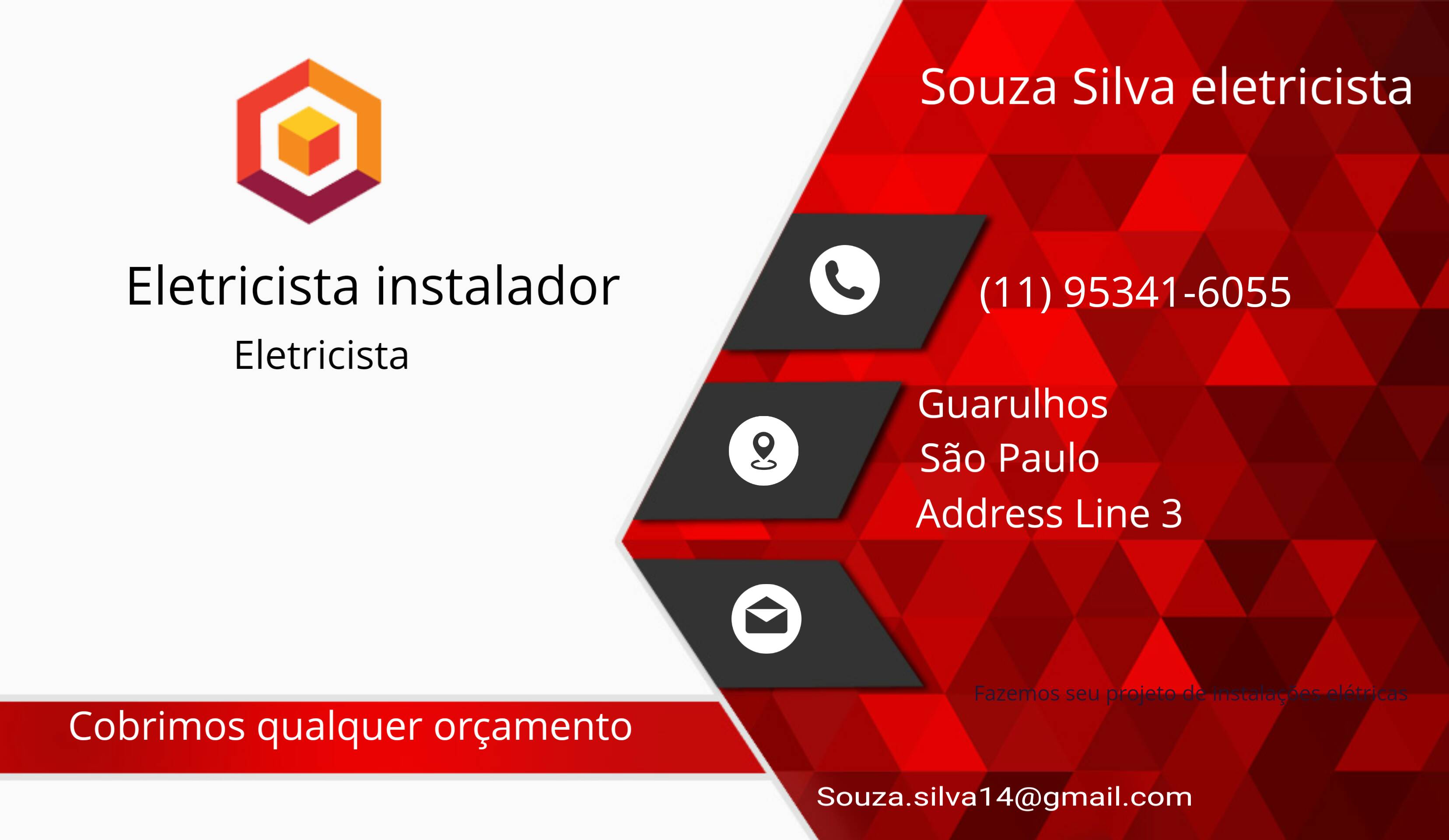 SOU ELÉTRICISTA, FAÇO REFORMAS EM GERAL NA PARTE ELÉTRICA, FAÇO INSTALAÇÃO NOVA DE FIAÇÃO, PADRÃO, MUDO DE 220 P/ 110 OU O CONTRARIO, INSTALO LUSTRE, TOMADAS, SOMOS SUPER BARATEIROS, DIVIDO NO CARTÃO DE CRÉDITO CASO PRECISO, SÓ CHAMAR NO ZAP 991253955 OU 991255354 ( GEO E GIL ELÉTRICA)