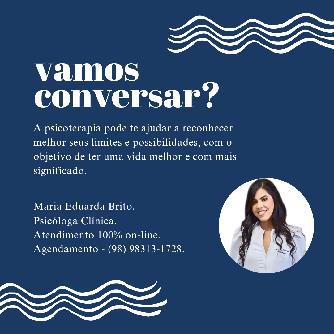 (71) 9 9239-3321OLÁ, SOU MARIA EDUARDA BRITO, PSICÓLOGA CLÍNICA COM UMA ABORDAGEM FOCADA NA TERAPIA COGNITIVO-COMPORTAMENTAL. OFEREÇO ATENDIMENTO 100% ON-LINE, PROPORCIONANDO COMODIDADE E ACESSIBILIDADE PARA VOCÊ CUIDAR DA SUA SAÚDE MENTAL NO CONFORTO DO SEU LAR. MEU OBJETIVO É AJUDAR VOCÊ A DESENVOLVER ESTRATÉGIAS EFICAZES PARA ENFRENTAR DESAFIOS EMOCIONAIS, MELHORAR A QUALIDADE DE VIDA E ALCANÇAR O BEM-ESTAR. VAMOS JUNTOS NESSA JORNADA DE AUTOCONHECIMENTO E TRANSFORMAÇÃO?