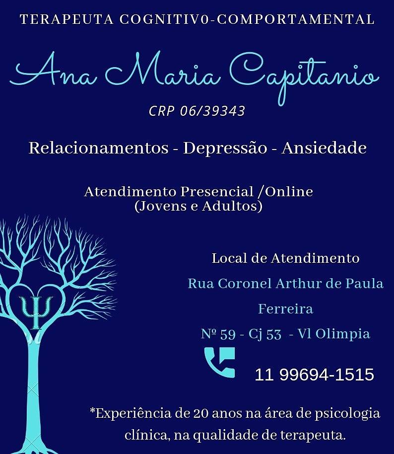 OLÁ, SOU PSICÓLOGA CLÍNICA HÁ MAIS DE 20 ANOS. TRABALHO COM A TERAPIA COGNITIVA COMPORTAMENTAL E ATENDO JOVENS E ADULTOS. SOU DOUTORA PELA USP E PROFESSORA UNIVERSITÁRIA. CONSULTÓRIO: RUA CORONEL ARTHUR DE PAULA FERREIRA, 59/CJ 53 VILA NOVA CONCEIÇÃO OU RUA ALEXANDRE DUMAS, 495 - CHÁCARA SANTO